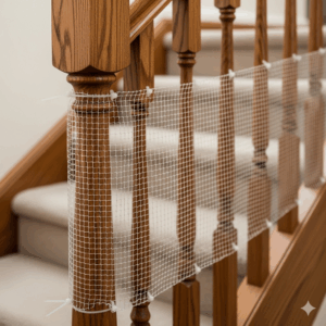 A close-up of a child-safe mesh barrier professionally installed on a staircase railing to prevent a toddler from falling through.how to baby proof staircase railing